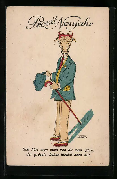 Künstler-AK Ochse im Anzug mit Hut und Gehstock wünscht Prosit Neujahr