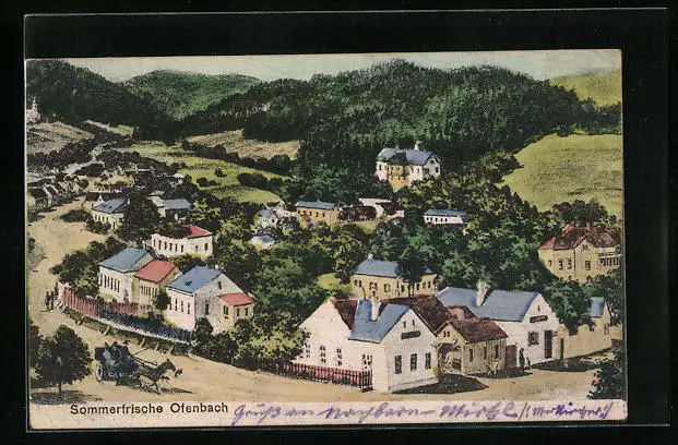 Künstler-AK Ofenbach, Ortsansicht mit Waldlandschaft