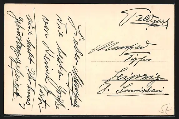 Personenbezogene Daten auf der Rückseite der Karte wurden durch blauen Textmarker unkenntlich gemacht. Die blauen Stellen sind auf die Vorderseite durchgeweicht und wirken sich negativ auf das Postkartenfoto aus
