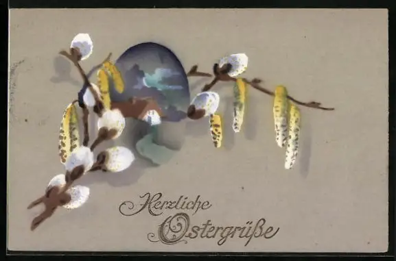 Künstler-AK Ostergrüsse, Palmkätzchenzweige mit Dorflandschaft