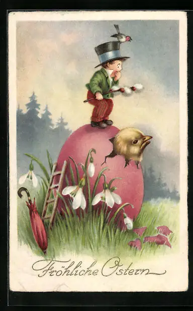 Künstler-AK Osterküken im Ei mit Maiglöckchen