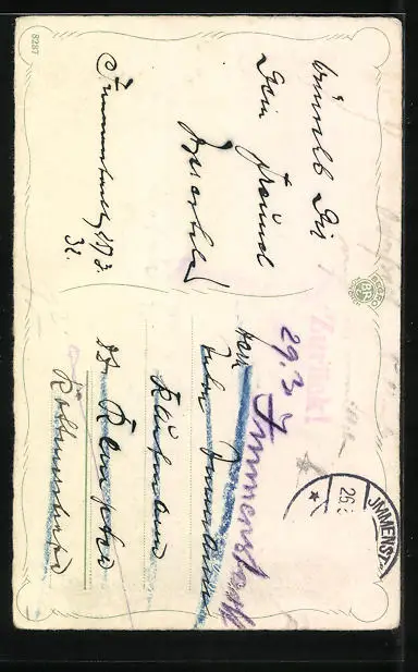 Personenbezogene Daten auf der Rückseite der Karte wurden durch blauen Textmarker unkenntlich gemacht. Die blauen Stellen sind auf die Vorderseite durchgeweicht und wirken sich negativ auf das Postkartenfoto aus