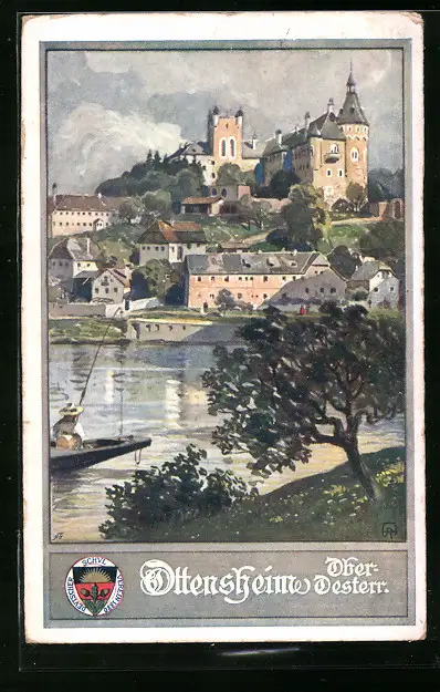 Künstler-AK Ottensheim, Uferpartie mit Boot