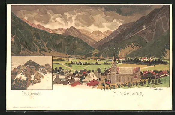 Künstler-AK Otto Strützel: Hindelang, Gesamtansicht, Hochvogel