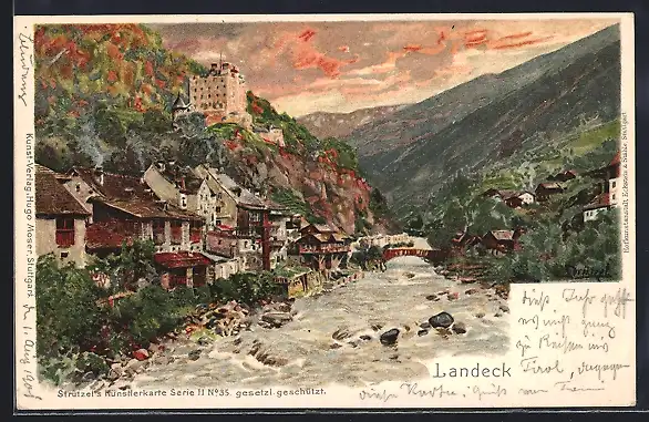 Künstler-AK Otto Strützel: Landeck, Ortsansicht mit Uferpartie