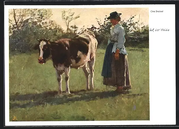 Künstler-AK Otto Strützel: eine Kuh steht auf der Weide