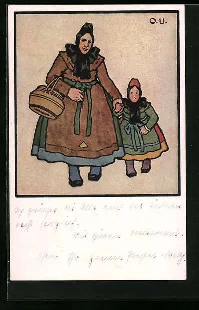 Künstler-AK Otto Ubbelohde: Mutter und Tochter in hessischen Trachten