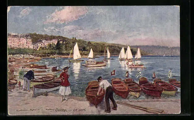 Künstler-AK Ouchy, Le port, Segelschiffe und Ruderboote im Hafen
