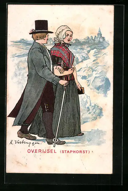 Künstler-AK Overijsel /Staphorst, Niederländisches Paar geht spazieren