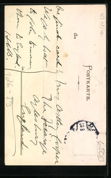 Personenbezogene Daten auf der Rückseite der Karte wurden durch blauen Textmarker unkenntlich gemacht. Die blauen Stellen sind auf die Vorderseite durchgeweicht und wirken sich negativ auf das Postkartenfoto aus