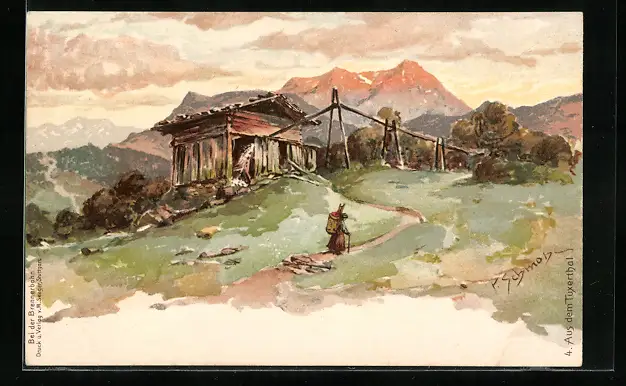 Künstler-AK P. Schmohl: Tuxerthal, Ortspartie mit Frau