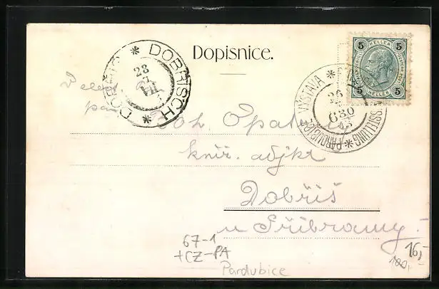 Personenbezogene Daten auf der Rückseite der Karte wurden durch blauen Textmarker unkenntlich gemacht. Die blauen Stellen sind auf die Vorderseite durchgeweicht und wirken sich negativ auf das Postkartenfoto aus