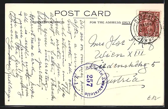 Personenbezogene Daten auf der Rückseite der Karte wurden durch blauen Textmarker unkenntlich gemacht. Die blauen Stellen sind auf die Vorderseite durchgeweicht und wirken sich negativ auf das Postkartenfoto aus
