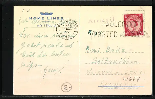 Künstler-AK Passagierschiff MS Italia auf hoher See, Home Lines