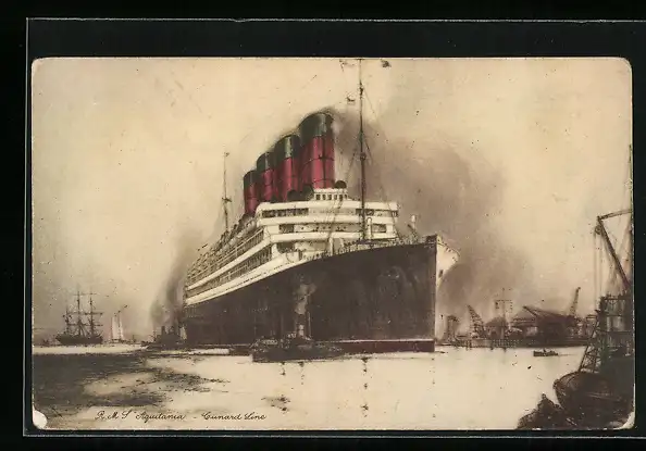 Künstler-AK Passagierschiff R.M.S. Aquitania im Hafen, Cunard Line
