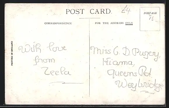 Personenbezogene Daten auf der Rückseite der Karte wurden durch blauen Textmarker unkenntlich gemacht. Die blauen Stellen sind auf die Vorderseite durchgeweicht und wirken sich negativ auf das Postkartenfoto aus
