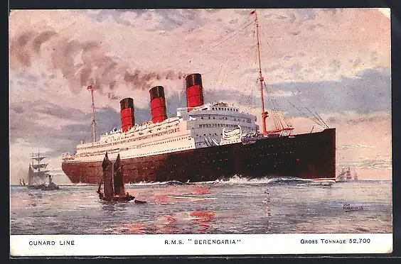 Künstler-AK Passagierschiff R.M.S. Berengaria der Cunard Line in Küstennähe