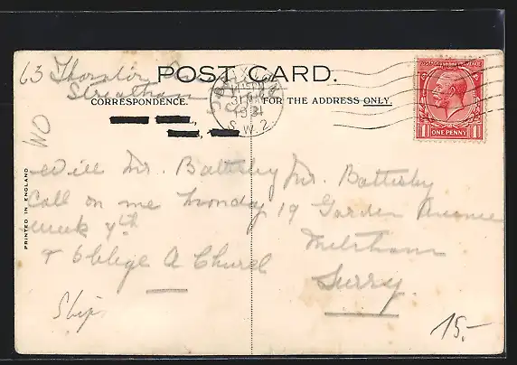 Personenbezogene Daten auf der Rückseite der Karte wurden durch blauen Textmarker unkenntlich gemacht. Die blauen Stellen sind auf die Vorderseite durchgeweicht und wirken sich negativ auf das Postkartenfoto aus