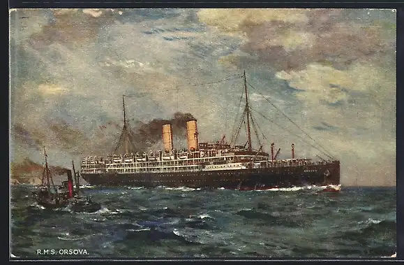 Künstler-AK Passagierschiff R.M.S. Orsova mit Schlepper, Orient Line