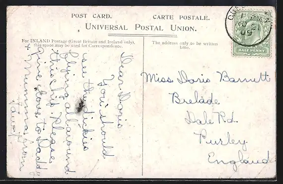 Personenbezogene Daten auf der Rückseite der Karte wurden durch blauen Textmarker unkenntlich gemacht. Die blauen Stellen sind auf die Vorderseite durchgeweicht und wirken sich negativ auf das Postkartenfoto aus