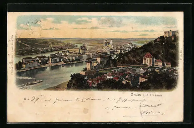 Künstler-AK Passau, Gesamtansicht aus der Vogelschau