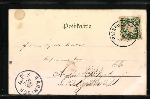 Personenbezogene Daten auf der Rückseite der Karte wurden durch blauen Textmarker unkenntlich gemacht. Die blauen Stellen sind auf die Vorderseite durchgeweicht und wirken sich negativ auf das Postkartenfoto aus