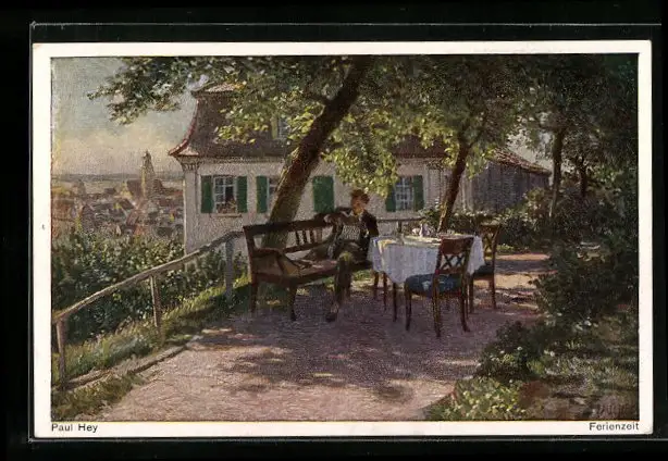 Künstler-AK Paul Hey: Herr sitzt lesend auf einer Bank am gedeckten Tisch