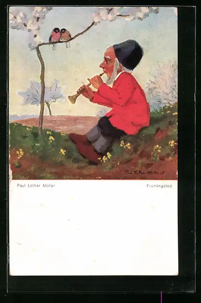 Künstler-AK Paul Lothar Müller: Zwerg spielt Flöte, Frühlingslied
