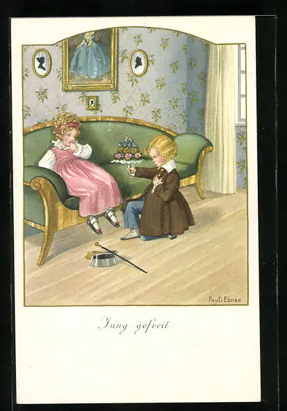 Künstler-AK Pauli Ebner: Jung gefreit, Junge überbringt seinem Mädchen Blumen