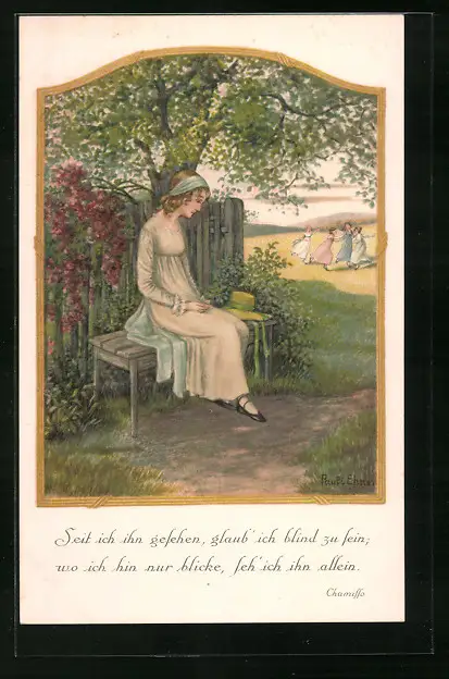 Künstler-AK Pauli Ebner: Verliebte junge Frau auf einer Bank