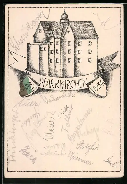 Künstler-AK Pfarrkirchen, Absolvia 1934, Studentenwappen