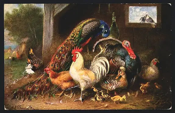 Künstler-AK Pfau, Truthahn, Erpel und Hahn, Geflügel