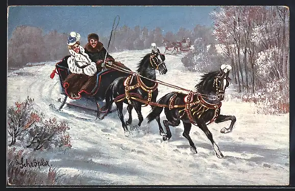 Künstler-AK Pferdeschlitten im verschneiten Wald