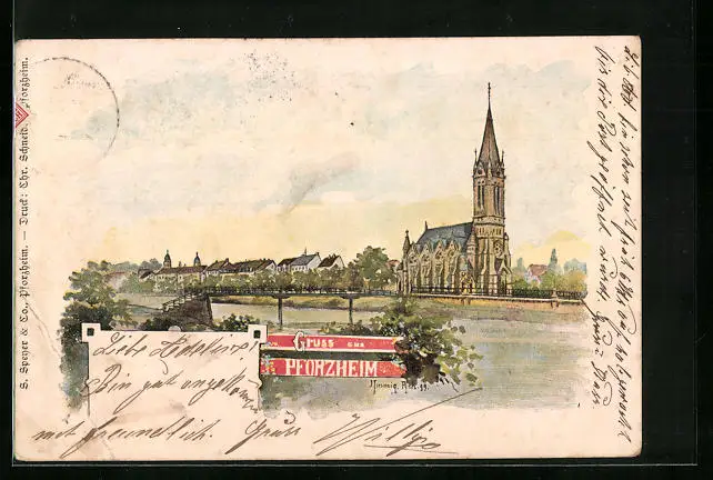 Künstler-AK Pforzheim, Teilansicht mit Kirche