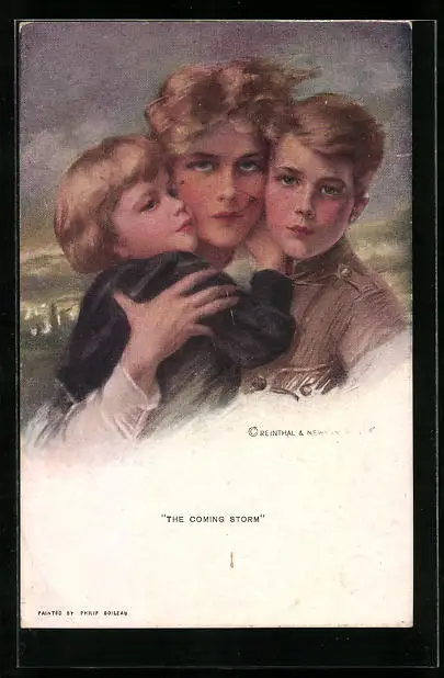 Künstler-AK Philip Boileau: Mutter umarmt schützend ihre beiden Kinder The Coming Storm