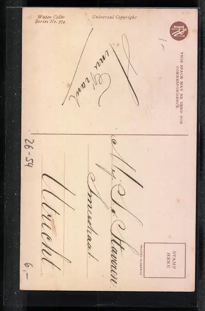 Personenbezogene Daten auf der Rückseite der Karte wurden durch blauen Textmarker unkenntlich gemacht. Die blauen Stellen sind auf die Vorderseite durchgeweicht und wirken sich negativ auf das Postkartenfoto aus