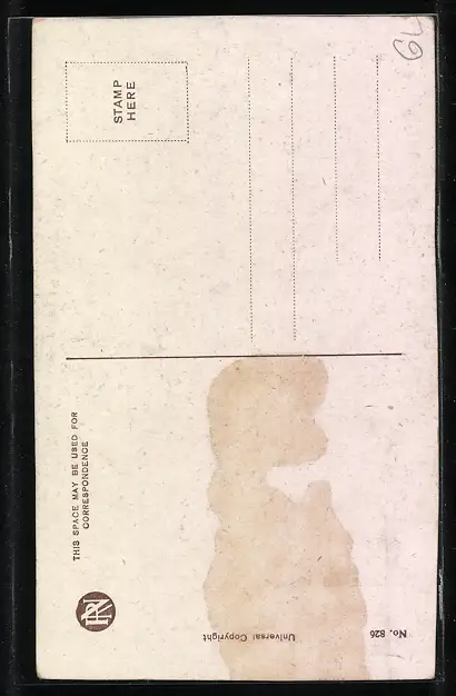 Personenbezogene Daten auf der Rückseite der Karte wurden durch blauen Textmarker unkenntlich gemacht. Die blauen Stellen sind auf die Vorderseite durchgeweicht und wirken sich negativ auf das Postkartenfoto aus