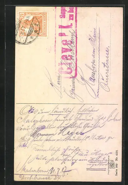 alte Ansichtskarte, gelaufen 1917, Eckknicke li. oben u. re. unten, Stempelspur, guter Zustand