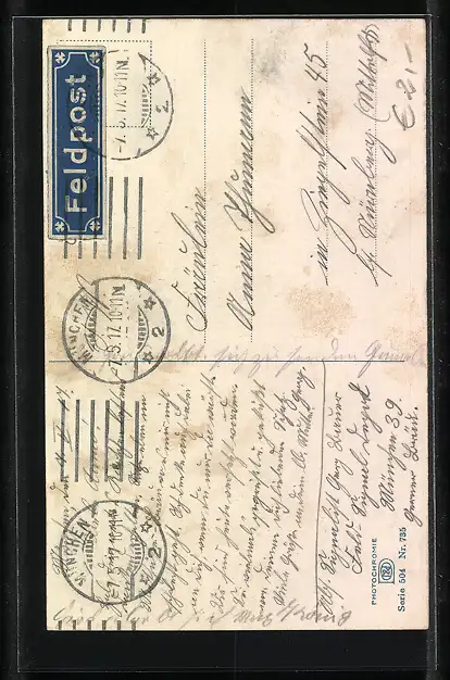 Personenbezogene Daten auf der Rückseite der Karte wurden durch blauen Textmarker unkenntlich gemacht. Die blauen Stellen sind auf die Vorderseite durchgeweicht und wirken sich negativ auf das Postkartenfoto aus