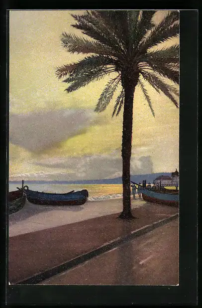 Künstler-AK Photochromie Nr.4860: Ruderboote am Strand, Palme