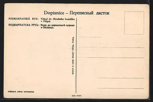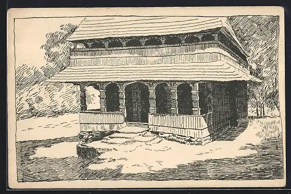 Künstler-AK Pilipec /Podkarpatská Rus., Vchod do dreveného kostelíka