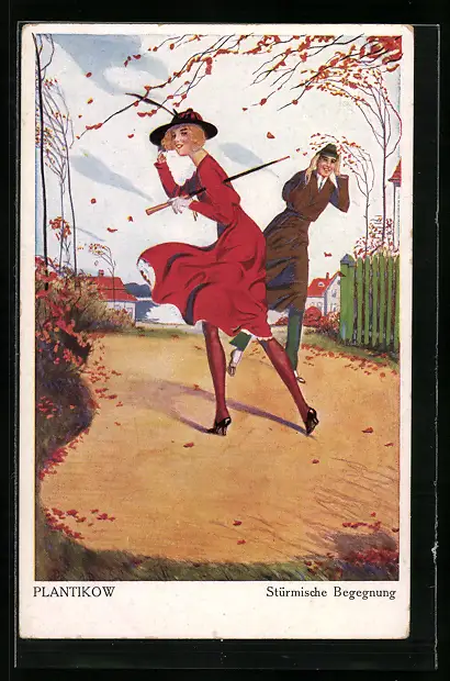 Künstler-AK Plantikow: Herr und Dame bei einer stürmischen Begegnung