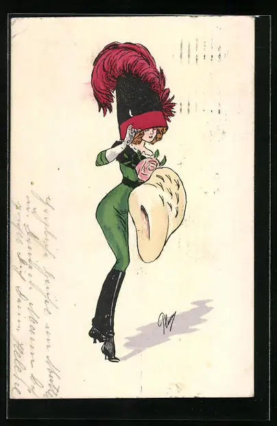 Künstler-AK Plum: Frau in engem grünem Kleid mit impostantem Federhut