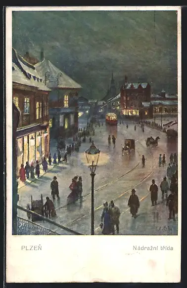 Künstler-AK Plzen, Nadrazni trida, Strassenbahn