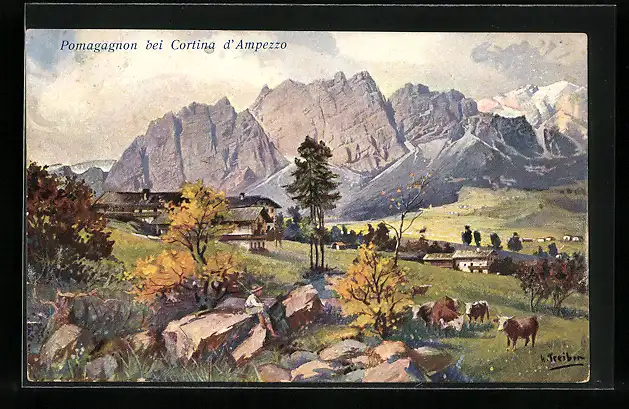 Künstler-AK Pomagagnon, Partie am Ortsrand mit Kühen