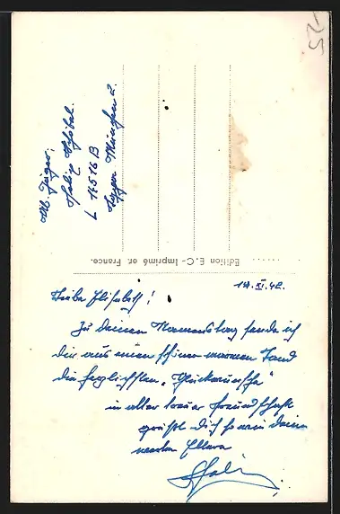Personenbezogene Daten auf der Rückseite der Karte wurden durch blauen Textmarker unkenntlich gemacht. Die blauen Stellen sind auf die Vorderseite durchgeweicht und wirken sich negativ auf das Postkartenfoto aus