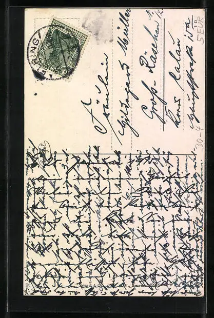 Personenbezogene Daten auf der Rückseite der Karte wurden durch blauen Textmarker unkenntlich gemacht. Die blauen Stellen sind auf die Vorderseite durchgeweicht und wirken sich negativ auf das Postkartenfoto aus