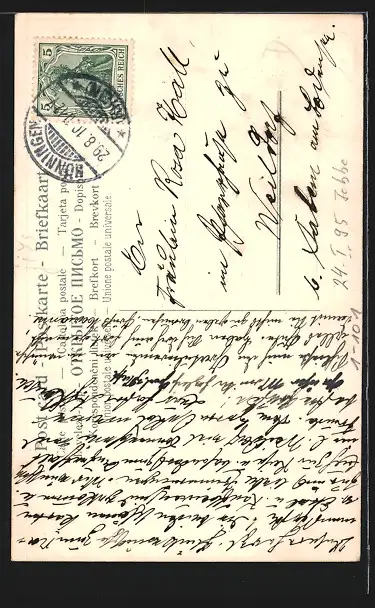 Personenbezogene Daten auf der Rückseite der Karte wurden durch blauen Textmarker unkenntlich gemacht. Die blauen Stellen sind auf die Vorderseite durchgeweicht und wirken sich negativ auf das Postkartenfoto aus