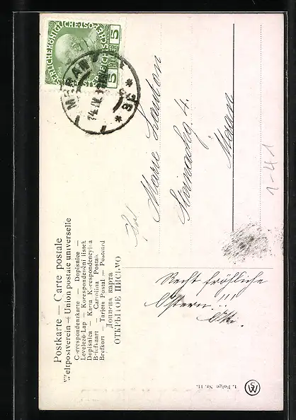 Personenbezogene Daten auf der Rückseite der Karte wurden durch blauen Textmarker unkenntlich gemacht. Die blauen Stellen sind auf die Vorderseite durchgeweicht und wirken sich negativ auf das Postkartenfoto aus