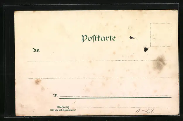 Personenbezogene Daten auf der Rückseite der Karte wurden durch blauen Textmarker unkenntlich gemacht. Die blauen Stellen sind auf die Vorderseite durchgeweicht und wirken sich negativ auf das Postkartenfoto aus